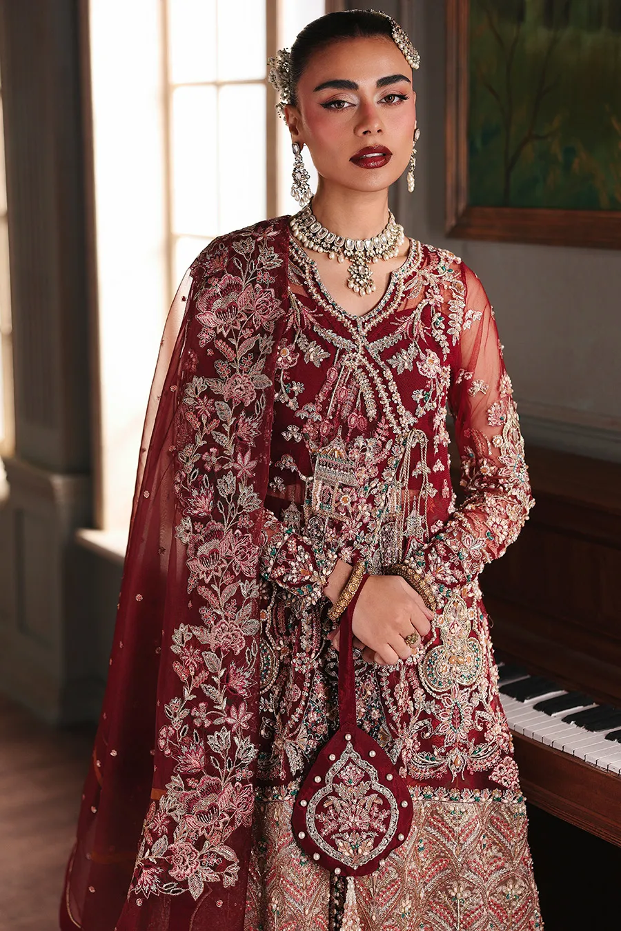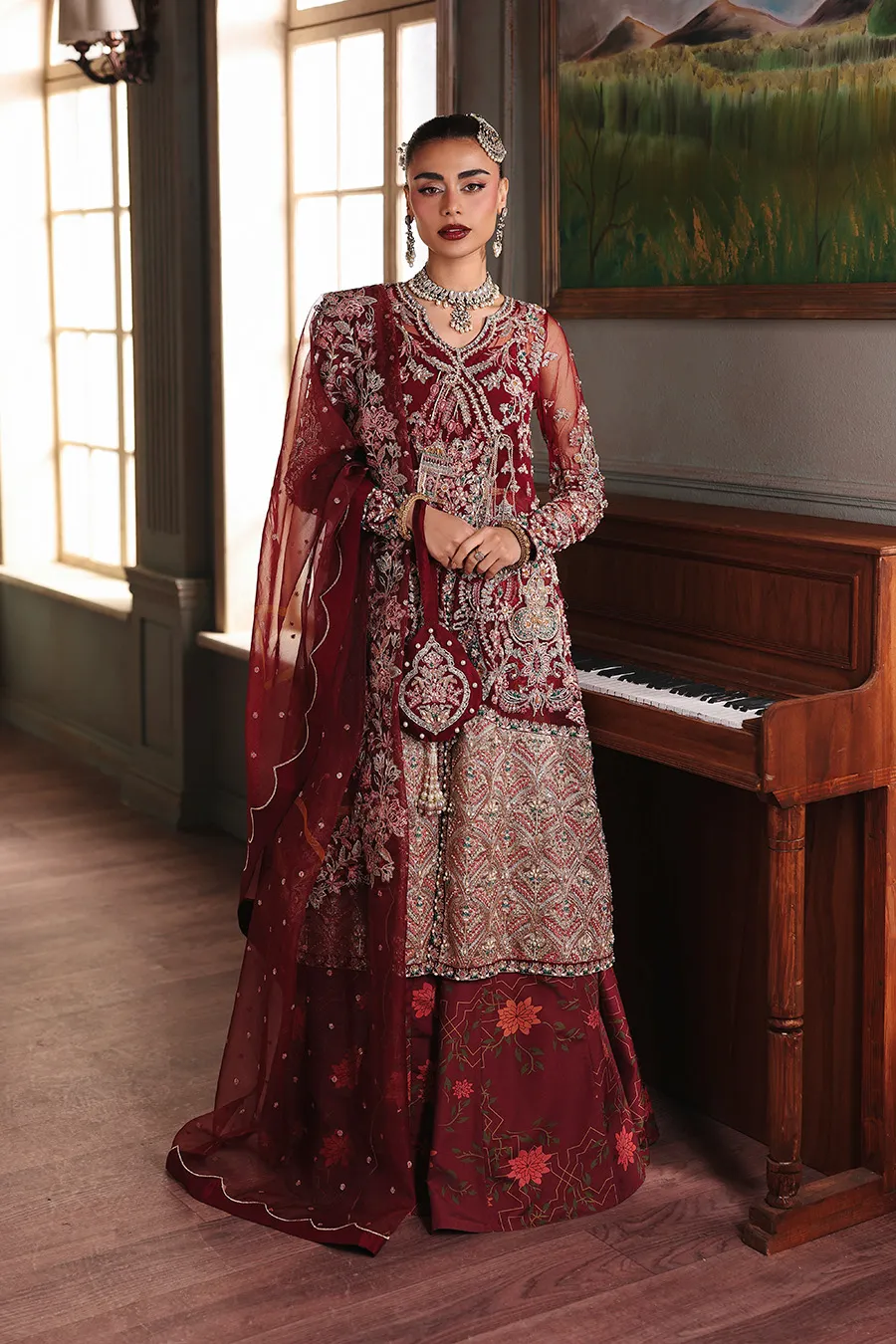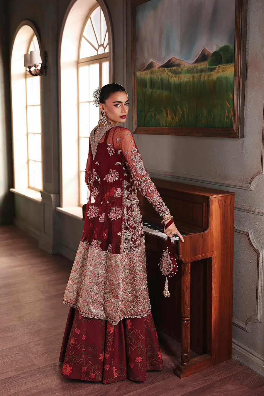 With Elysia, intricate hand embellishment adorns a net angrakha, its silhouette defined by a graceful cutline and layered over a printed pishwas. An embroidered border adds depth, while a dual-textured dupatta and complimentary potli complete the composition. This is artistry articulated through balance, where structure and fluidity find harmonious expression.