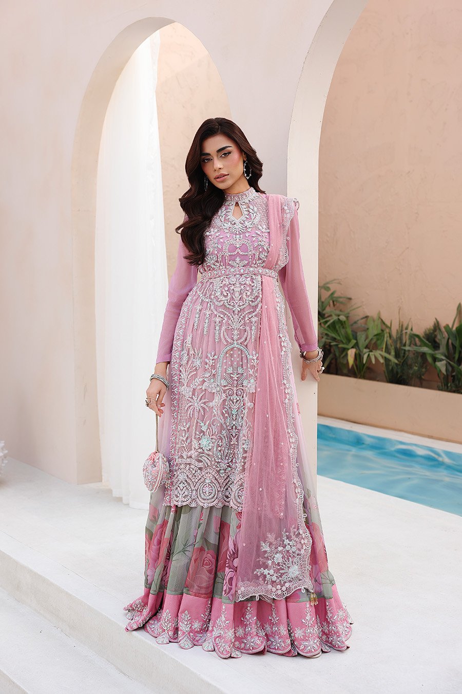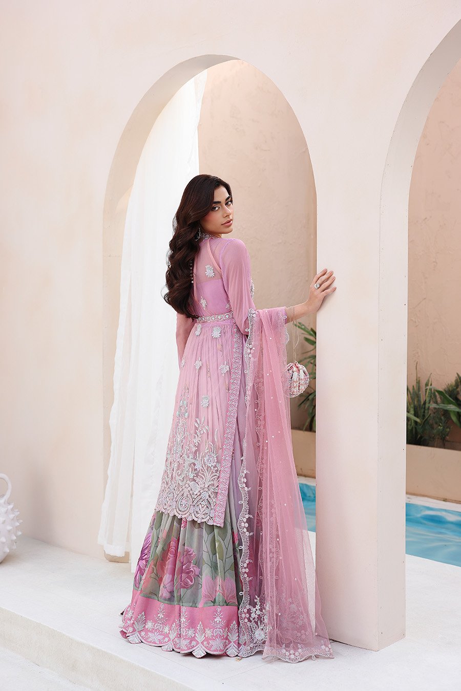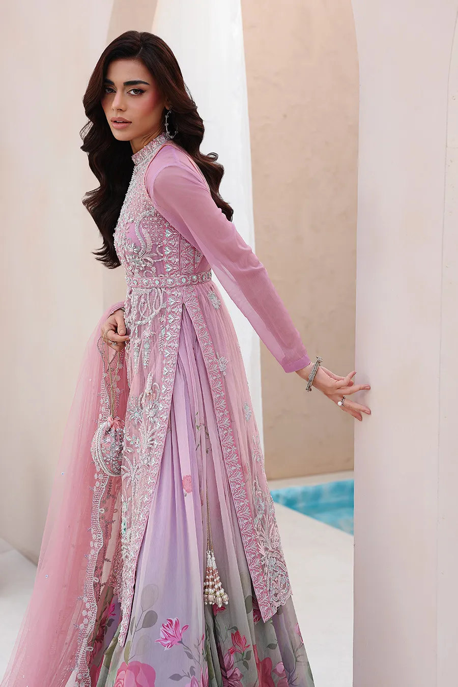 In crafting Reverie, we sought a balance between statement and subtlety. The halter is fully sculpted by hand embellishment, its neckline and belt detailed with intention. It is paired with a gown of soft beach print and generous flare, a study in fluidity. The ensemble is completed with a cutwork dupatta and a complimentary potli, a personal gesture to signify the finish. This is where deliberate craft translates into a state of quiet confidence.