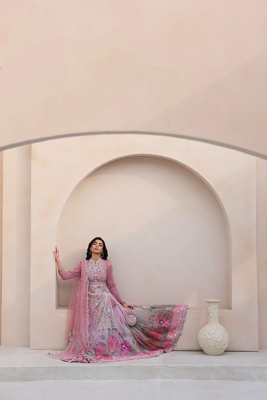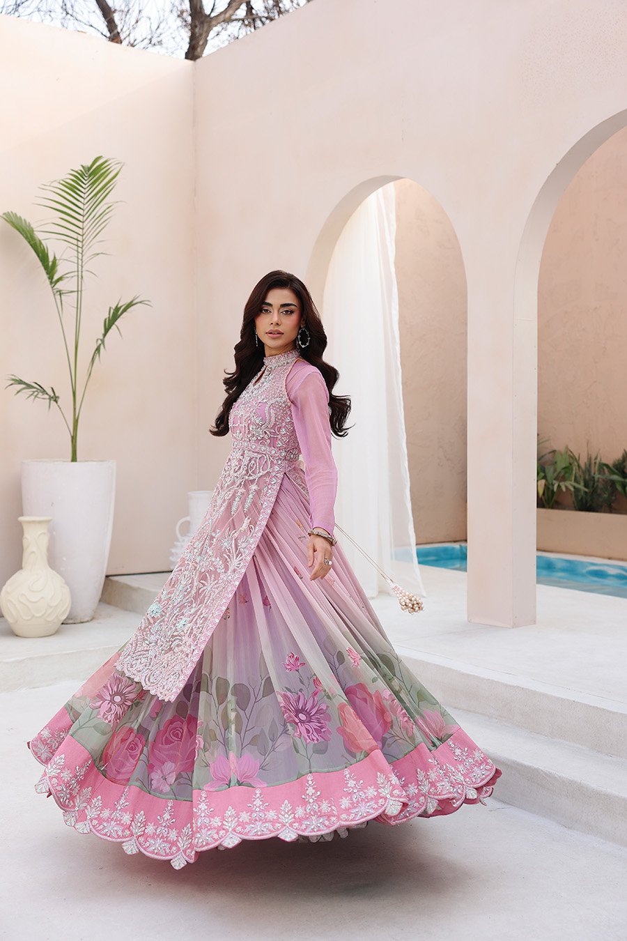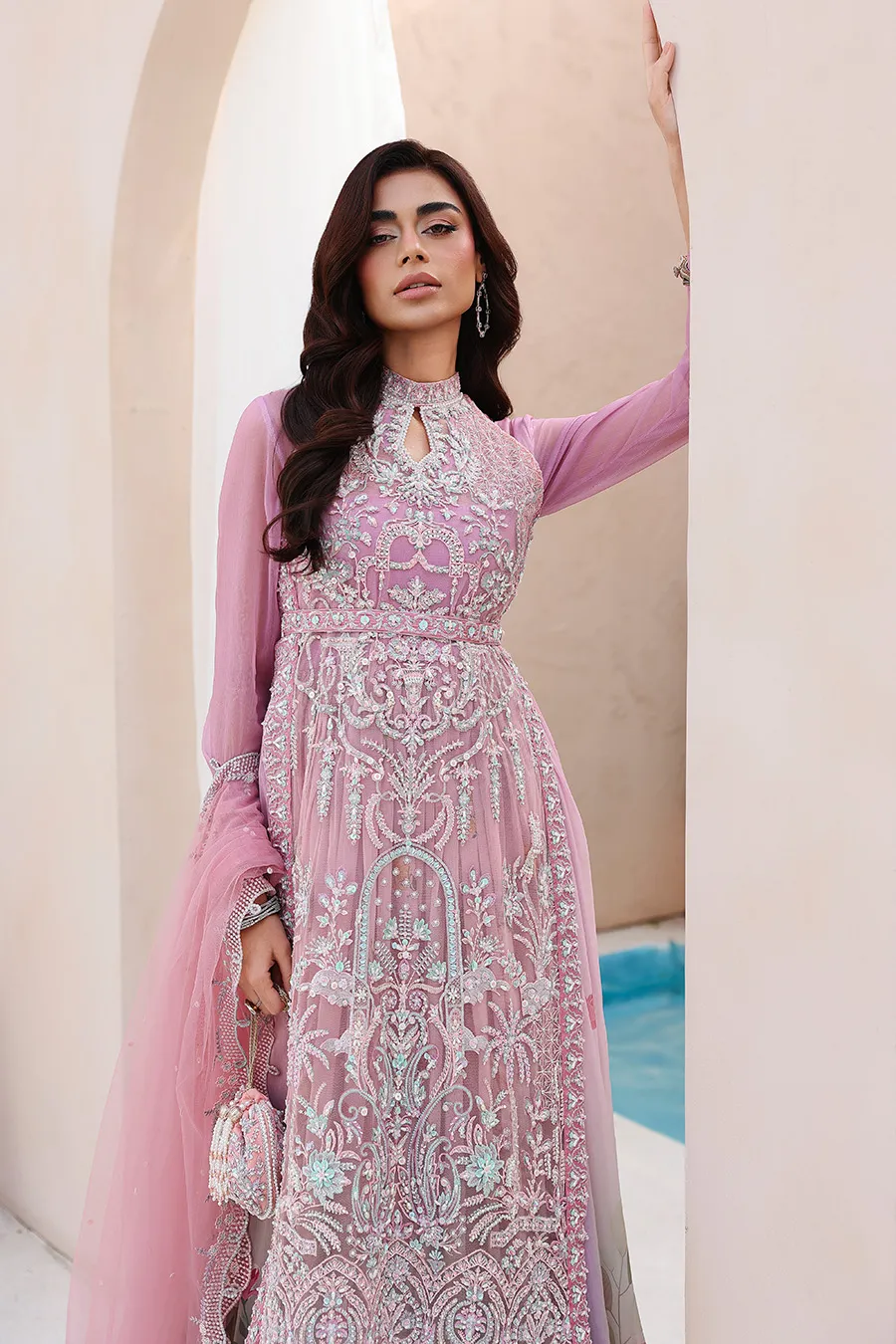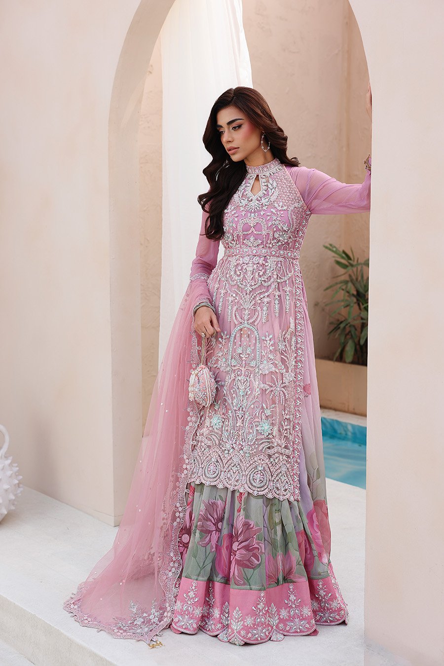 In crafting Reverie, we sought a balance between statement and subtlety. The halter is fully sculpted by hand embellishment, its neckline and belt detailed with intention. It is paired with a gown of soft beach print and generous flare, a study in fluidity. The ensemble is completed with a cutwork dupatta and a complimentary potli, a personal gesture to signify the finish. This is where deliberate craft translates into a state of quiet confidence.