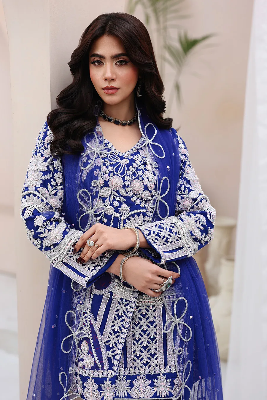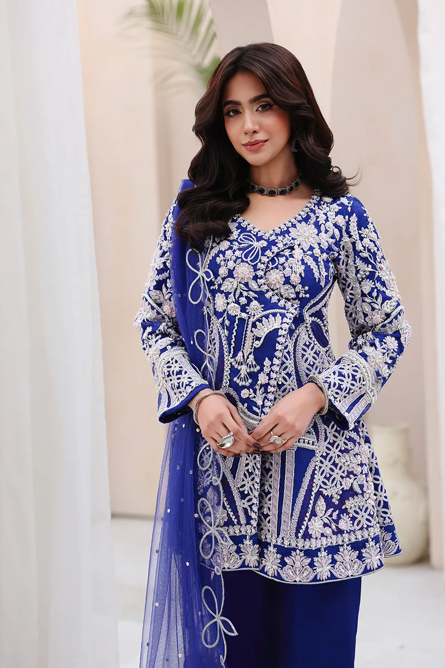 In Stellina, a bold silhouette is rendered in luminous blue. The structured jacket is meticulously detailed with intricate embroidery, sequins, and pearls, its sharp lines balanced by the fluid drape of the boot cut and the soft embroidery of a net dupatta. Each element, from the embroidered patch to the bordered finish, is a deliberate note in a composition of modern elegance. This is where decisive form is animated by meticulous craft.
